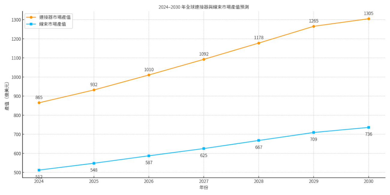 圖:2024–2030 年全球連接器與線束市場產值預測(單位:億美元)