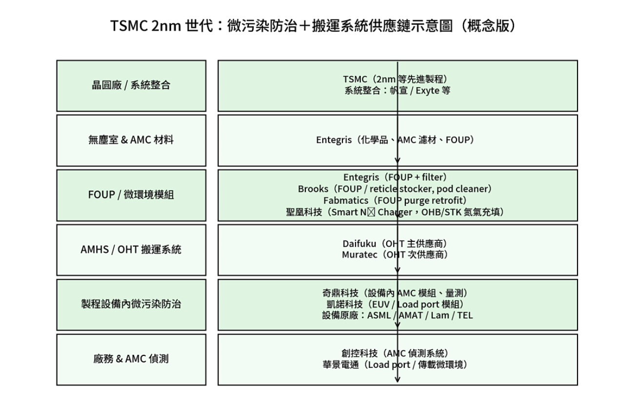 - 上圖圖片說明:此圖為概念性供應鏈示意,強調「誰主要貢獻哪一段」而非精確市佔。同一晶圓廠買務上會同時採用多家國際廠商+本土廠商的組合,並依不同廠區/節點分案導入。