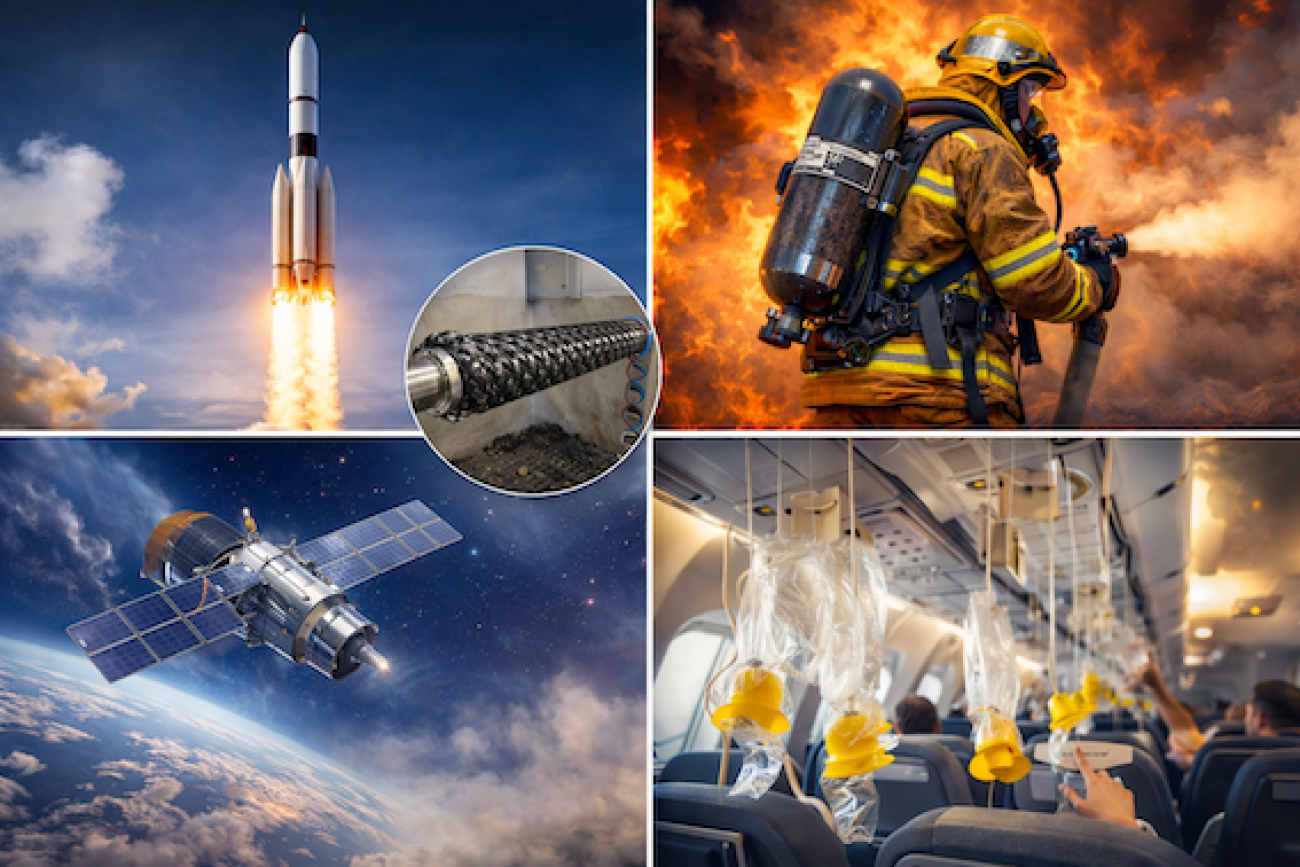 美國太空總署(NASA)為執行太空計畫而推升碳纖維氣瓶產業;NASA 於 1975 年將碳纖維材料技術轉作民間技術、用於消防員隨身背負高壓氣瓶材料。消防員身負救災重任,其背負輕量化氣瓶一直是個封閉市場,全球在消防員揹的氣瓶產品,是少數一、兩家公司所寡佔。隨著相關廠商消長,益材直到 2025、2026 年才算開始可介入消防員氣瓶應用。