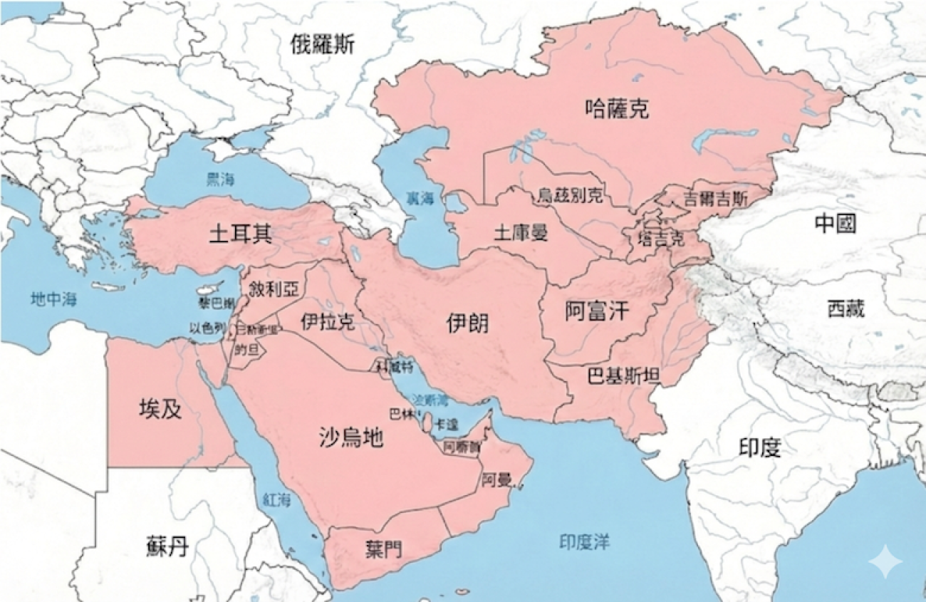 圖說:中東地區地圖(涵蓋主要國家)