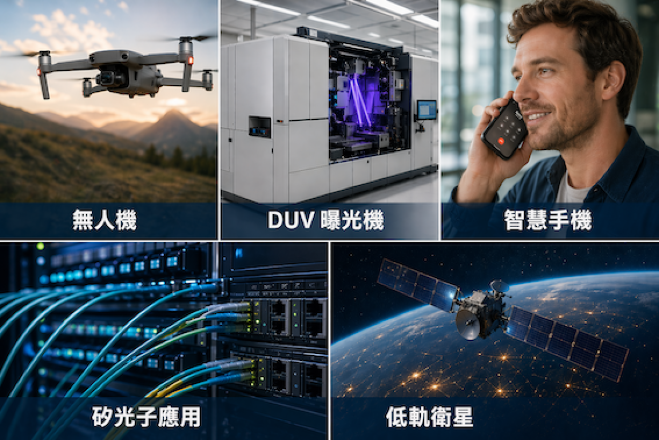 耀穎光電目前產品應用於電影攝影機核心元件的光學鍍膜,半導體設備元件,智慧型手機光學感測,智能手錶與掃地機器人光感測,衛星光學(太空領䧕)系統,電動車,AI 眼鏡及矽光子(CPO)元件等。